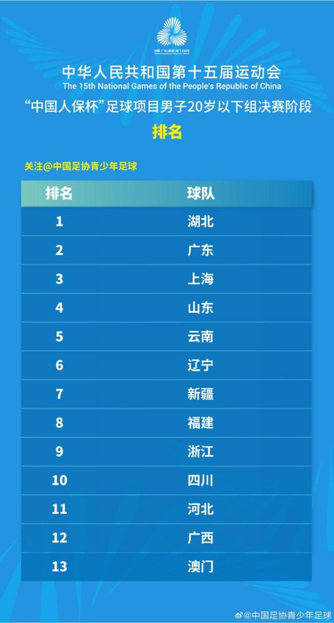 本次全运会U20男足的最终排名确定:湖北、广东、上海分列前三,韩鹏执教的山东屈居第四,云南、辽宁、新疆、福建分列5-8位,王钰栋所在的浙江排名第9,四川、河北、广西、澳门位列最后4位。