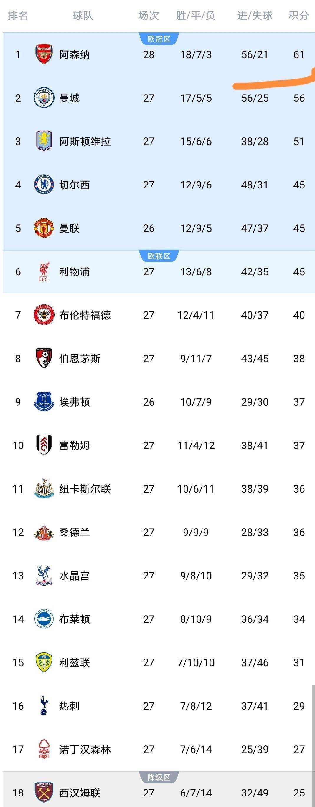 这四场比赛的结果直接导致了英超积分榜的剧烈震荡。 阿森纳在拿下这关键三分后,积分上涨至61分,在多赛一场的情况下,暂时领先第二名曼城队5分。 腾讯网的积分榜更新显示,曼城少赛一场积56分紧追其后,阿斯顿维拉以51分位列第三。 而输球的热刺积分则停留在29分,排名跌至第16位,仅领先降级区4分。 热刺的保级警报已经拉响。